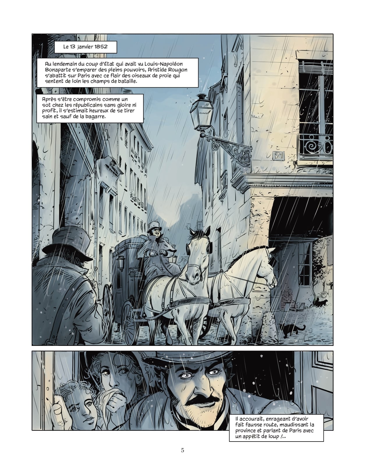 Ce roman, le deuxième volume de la série Les Rougon-Macquart, est une dénonciation acide de la spéculation immobilière des années 1850 et 1860. On n’en attendait pas moins d’Emile Zola, irréductible opposant au Second Empire. A travers le destin d’un parvenu, prêt à toutes les bassesses pour arriver à ses fins, l’écrivain dresse le portrait d’une bourgeoisie d’affaire sans foi ni loi qui profite de ses entrées à la commission d’expropriation pour réaliser des plus-values aussi artificielles que juteuses. Les sommes en jeu sont, il est vrai, colossales. On estime entre 1 200 000 000 et 1 400 000 000 francs les dépenses pour les opérations de voiries, financées par des emprunts dont les derniers ne seront remboursés qu’en 1910. Dans La Curée, la transformation et la modernisation du centre de Paris passent au second plan derrière les excès de la finance (qui continuerons d’ailleurs après l’avènement de la IIIe République). Cédric Simon et Eric Stalner réussissent le tour de force d’adapter cet épais volume en 120 pages de bande dessinée, sans pesanteurs. « Les » Paris, des quartiers populaires aux hôtels particuliers de la bonne société, sont parfaitement mis en scène. Les enjeux économiques, les codes relationnels de la haute bourgeoisie, l’antichambre du pouvoir, les considérations géopolitiques habillent de manière détaillée cette plongée saisissante dans le Second Empire.